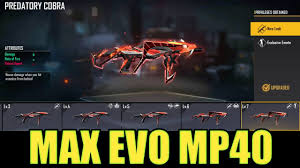 COBRA MP40 NEW UPCOMING GUN IN FREEFIRE COBRA MP40 IS A EVOLUTION GUN MAXIMUM LEVEL OF THIS UPGRADE IS 7